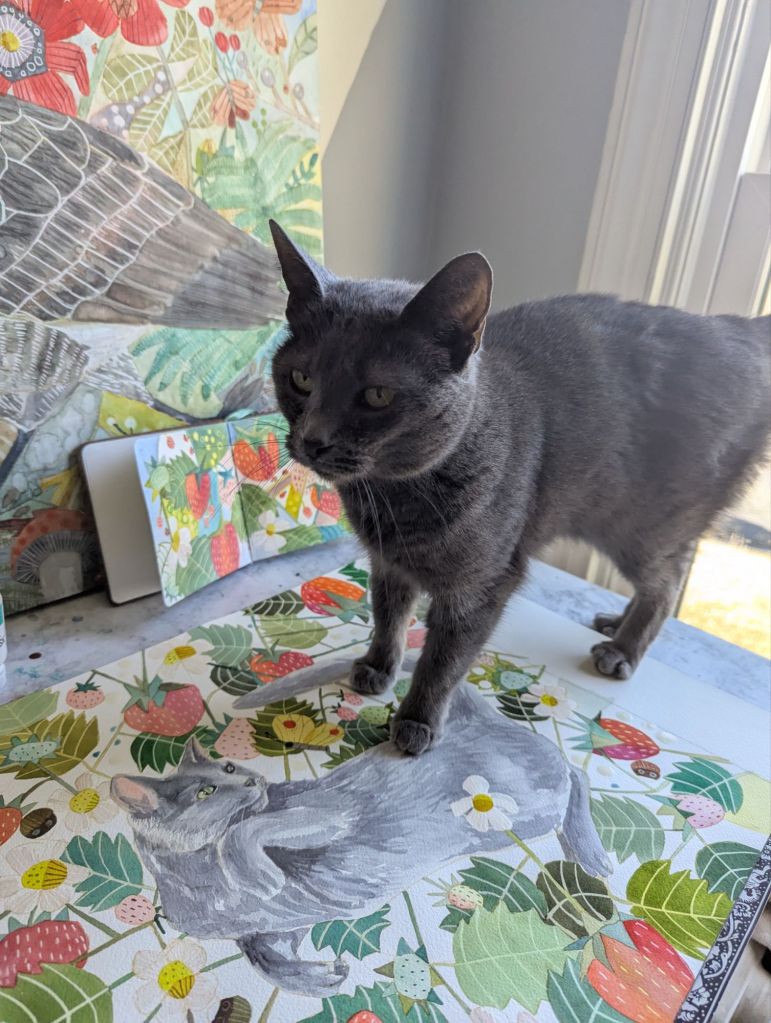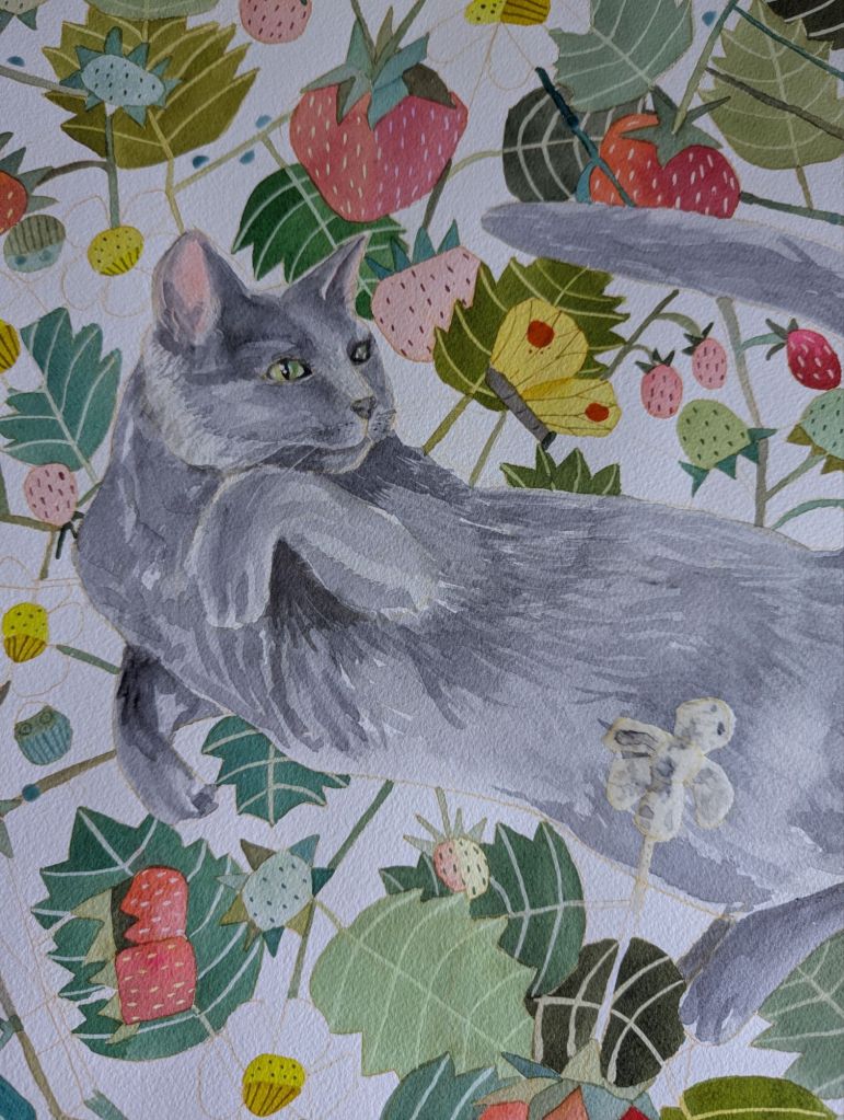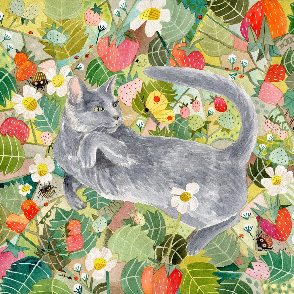 Like many of my paintings, this one was done with a limited palette featuring one of my newest favorite colors, pyrrole orange. It makes such juicy reds and pinks and really stands out on its own as well. The cat is inspired by my own gray cat, Gigi Babycat, who insists on being involved in the art studio. I also really love painting strawberries in general and am hoping to design a repeat pattern with them in the future as a fabric design.