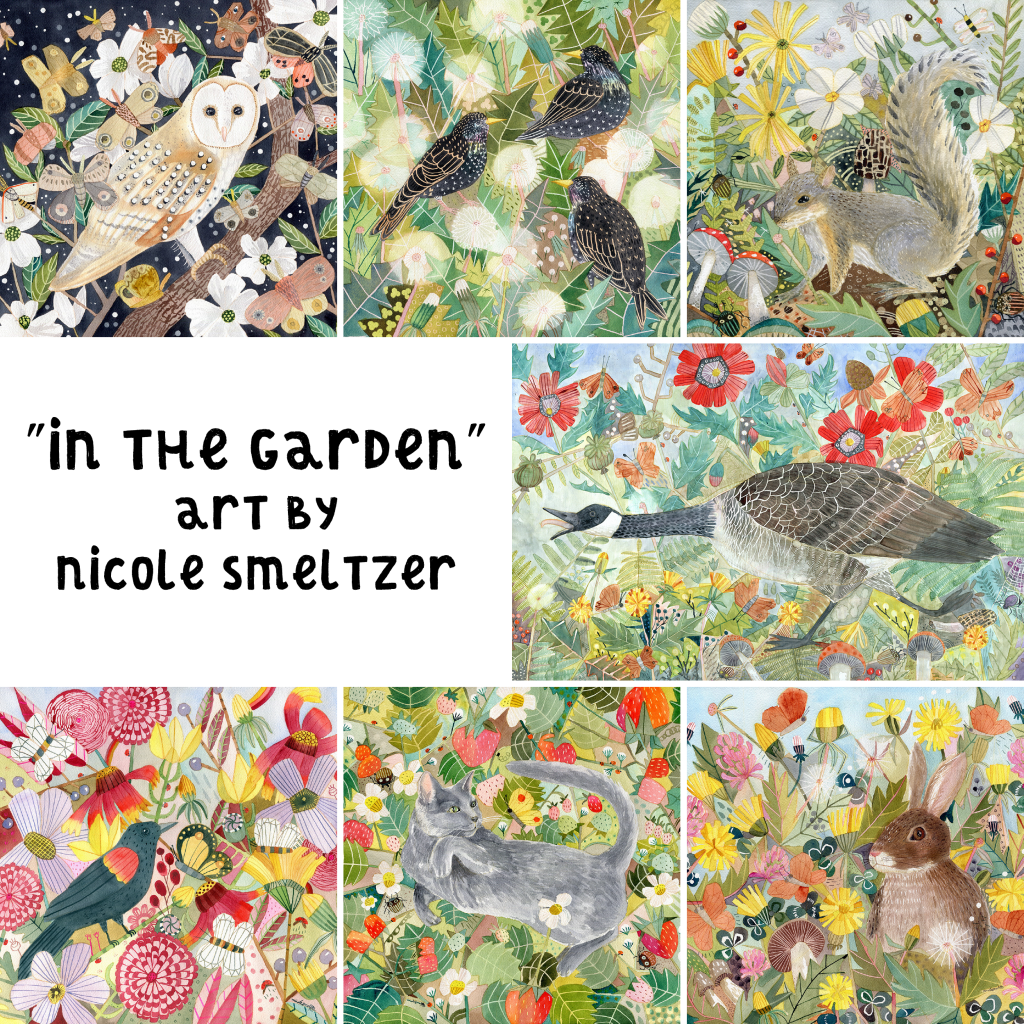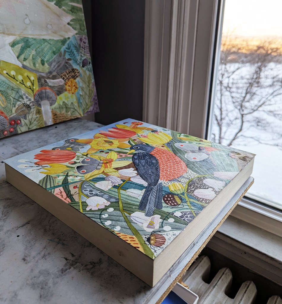 Robin and Spring Garden, watercolor on paper mounted to cradled wood panel and sealed with cold wax, 12″x12″